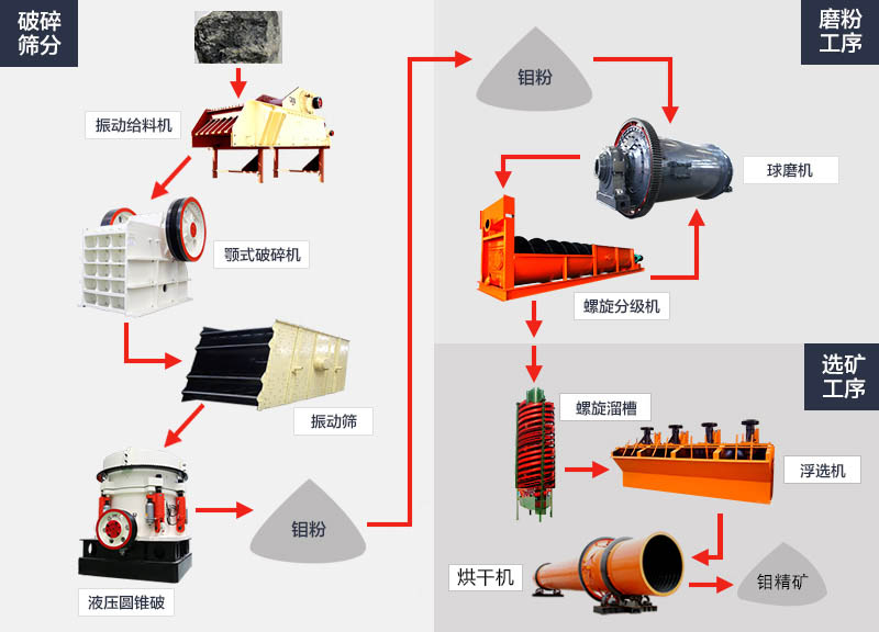 大塊的鉬礦石經(jīng)料倉由振動給料機均勻地送進顎式破碎機進行粗碎;粗碎后的鉬礦石經(jīng)過振動篩篩分后,由皮帶輸送機送到液壓圓錐式破碎機進行細碎;